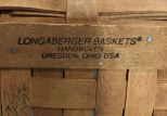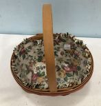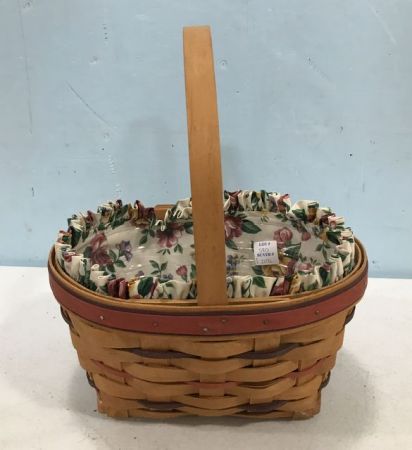 Longaberger basket, with cloth and plastic liner, handled, 12"h., 10"w. Longaberger basket, with cloth and plastic liner, handled, 12"h., 10"w.