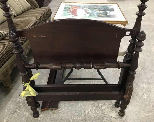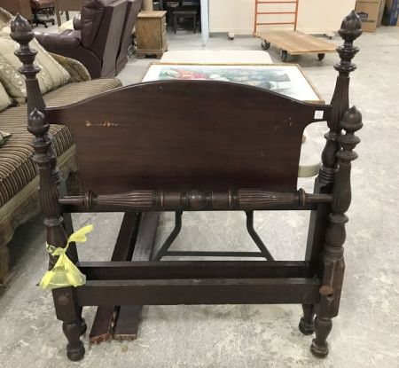 Mahogany Mini Post Twin Bed, has wood rails with bolts, acorn finials. Mahogany Mini Post Twin Bed, has wood rails with bolts, acorn finials.