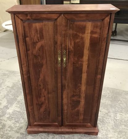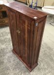 Pine Low Profile Storage Cabinet, two door, with shelves, has scratches on Finish, 40"h., 24"w., 7 1/2"d. Pine Low Profile Storage Cabinet, two door, with shelves, has scratches on Finish, 40"h., 24"w., 7 1/2"d.