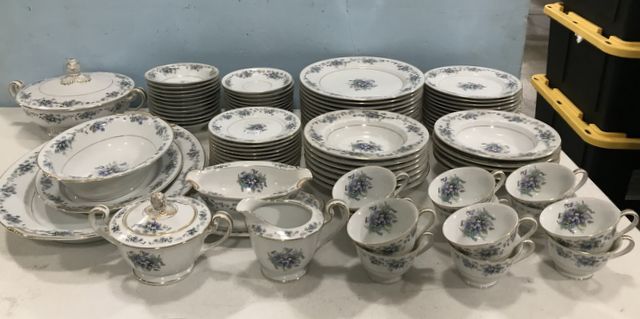 Noritake "Violette" China Set, 12 dinner plates, 12 salad plates, 12 dessert plates, bowls, berry bowls, saucers, cups, platters, tureen, gravy boat, sugar, creamer. Noritake "Violette" China Set, 12 dinner plates, 12 salad plates, 12 dessert plates, bowls, berry bowls, saucers, cups, platters, tureen, gravy boat, sugar, creamer.
