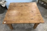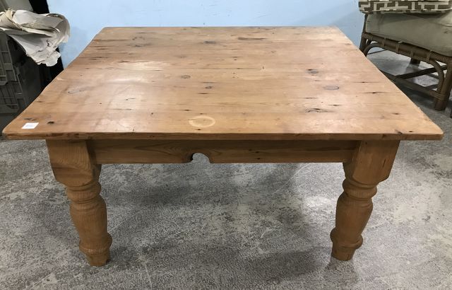 Farm Style Pine Square Top Coffee Table, has finish wear, needs tightening, 17"h., 36"sq. Farm Style Pine Square Top Coffee Table, has finish wear, needs tightening, 17"h., 36"sq.