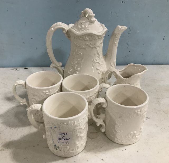 Vintage white ceramic tea set, four mugs, creamer, and pitcher 8"h. Vintage white ceramic tea set, four mugs, creamer, and pitcher 8"h.