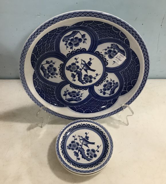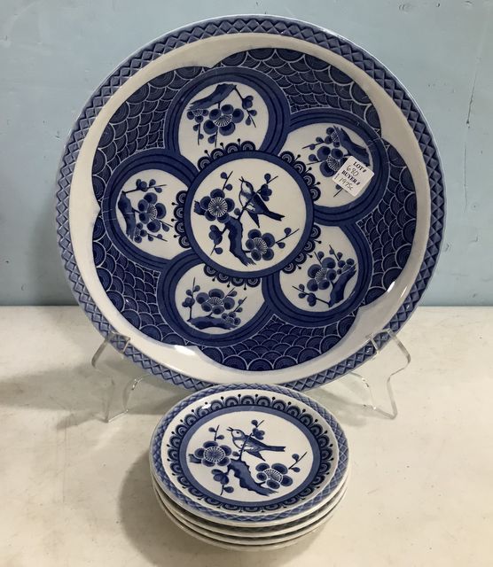 Blue and White Charger and Plates, bird designs, charger is 12"dia. Blue and White Charger and Plates, bird designs, charger is 12"dia.