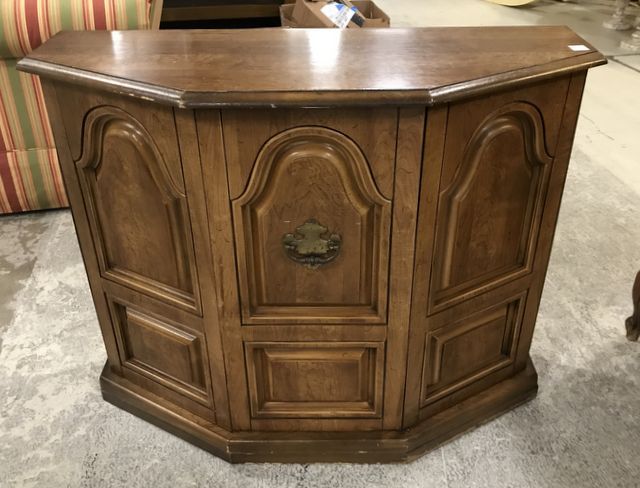 Vintage Demi Lune Wall Commode, single door, has some wear, 29"h., 36"w., 13"d. Vintage Demi Lune Wall Commode, single door, has some wear, 29"h., 36"w., 13"d.