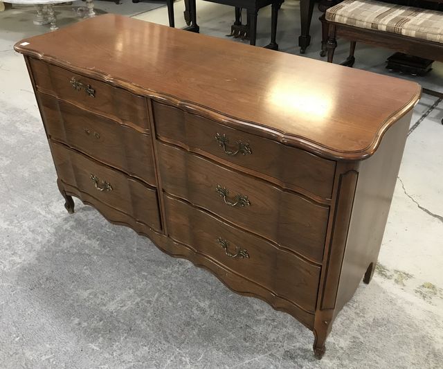 Vintage French Style Double Dresser, 6 drawers, missing one pull, has scratches on finish, included mirror, 32"h., 54"w. ,19"d. Vintage French Style Double Dresser, 6 drawers, missing one pull, has scratches on finish, included mirror, 32"h., 54"w. ,19"d.