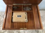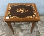 Italian Modern Sewing Stand, music box, inlaid designs, lacquered, music box, 17"h., 15"w. Italian Modern Sewing Stand, music box, inlaid designs, lacquered, music box, 17"h., 15"w.