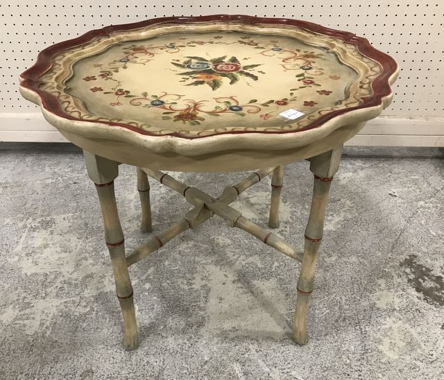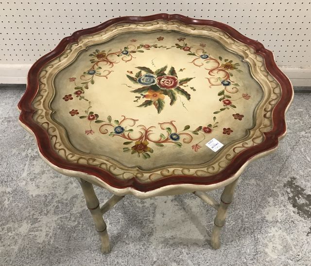 New Pie Crest Style Coffee Table, factory painted white and red, flower imagery, top lifts off, 20"h., 24"w. New Pie Crest Style Coffee Table, factory painted white and red, flower imagery, top lifts off, 20"h., 24"w.