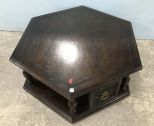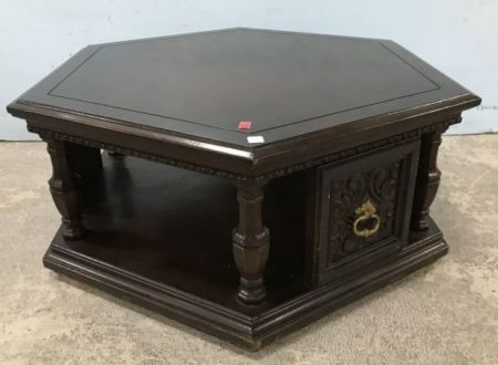 Vintage French Provincial Octagon Coffee Table, dark stain finish, two doors, two tier, 16"h., 44"w. Vintage French Provincial Octagon Coffee Table, dark stain finish, two doors, two tier, 16"h., 44"w.