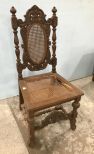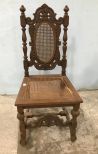Antique oak hall chair, ornate carved, damaged cane seat, cane back, finish is worn, 44"h. Antique oak hall chair, ornate carved, damaged cane seat, cane back, finish is worn, 44"h.
