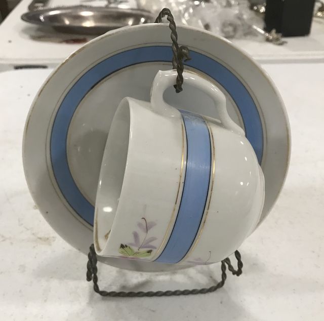 Porcelain Mustache Guard Coffee Cup and Saucer, hand painted blue banded. Porcelain Mustache Guard Coffee Cup and Saucer, hand painted blue banded.