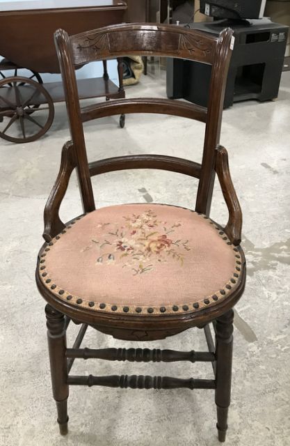 Antique Eastlake Sewing Chair, needle point pink cushion, walnut, 33"h. Antique Eastlake Sewing Chair, needle point pink cushion, walnut, 33"h.