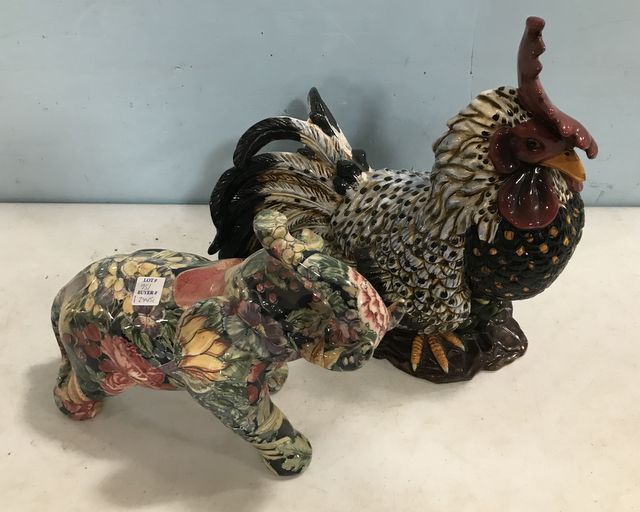 Hand painted ceramic rooster 15"h., and floral painting ceramic elephant. Hand painted ceramic rooster 15"h., and floral painting ceramic elephant.