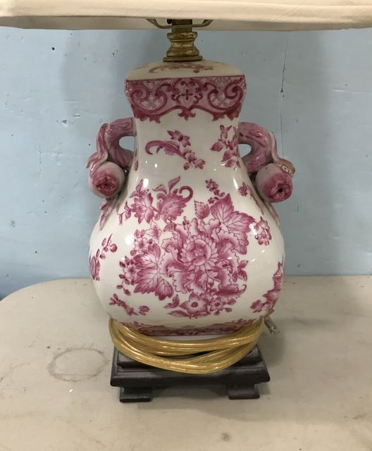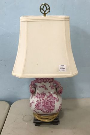 Pink and White Ceramic Urn Lamp, floral, wood footed base, brass finial, 22"h. Pink and White Ceramic Urn Lamp, floral, wood footed base, brass finial, 22"h.
