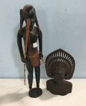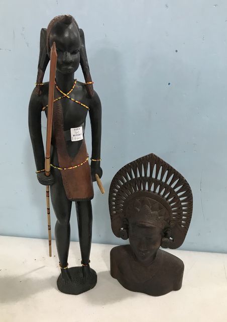 Wood carved tribal warrior 24"h., and wood carved head dress woman. Wood carved tribal warrior 24"h., and wood carved head dress woman.