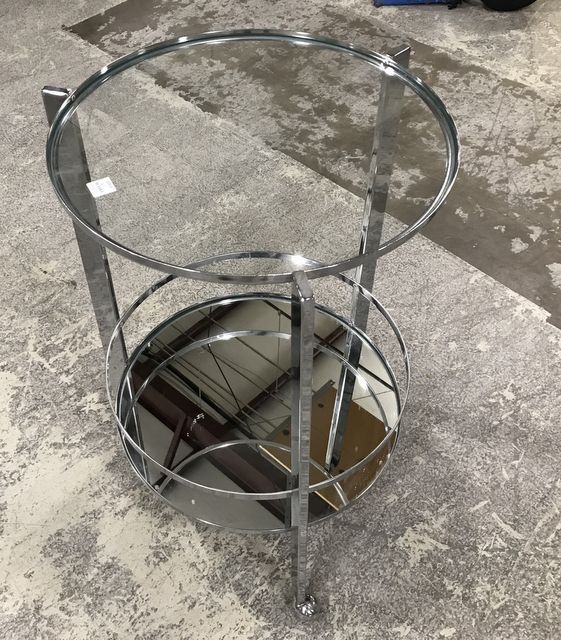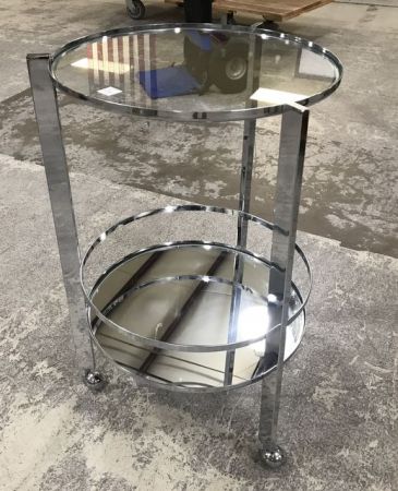 Contemporary Metal Liquor Display Cart, mirror bottom, clear glass top, on wheels, 30"h., 18"w. Contemporary Metal Liquor Display Cart, mirror bottom, clear glass top, on wheels, 30"h., 18"w.