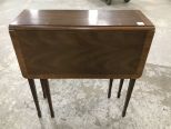 Small French Style Gate Leg Table, drop leaf, banded style, one leg has been repaired, 24"h., 22"w., 8"w. Small French Style Gate Leg Table, drop leaf, banded style, one leg has been repaired, 24"h., 22"w., 8"w.