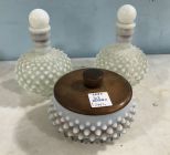 Three Vintage Pieces of Hobnail Glass, pair of perfumes 6"h., hobnail container. Three Vintage Pieces of Hobnail Glass, pair of perfumes 6"h., hobnail container.