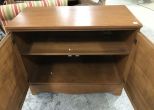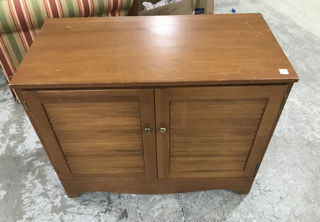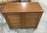 Contemporary Two Door Commode, slat front door design, single shelf, has scratches on finish, 30"h., 36"w., 17"d. Contemporary Two Door Commode, slat front door design, single shelf, has scratches on finish, 30"h., 36"w., 17"d.