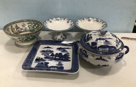 Blue and White Chinese pot with lid, Chinese blue and white square plate, Asian style compote, and Pair of Alphand compotes. Blue and White Chinese pot with lid, Chinese blue and white square plate, Asian style compote, and Pair of Alphand compotes.