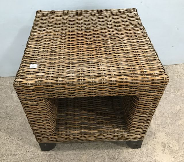 Two tier wicker patio table, light wicker damage, 23"h., 23"w. Two tier wicker patio table, light wicker damage, 23"h., 23"w.
