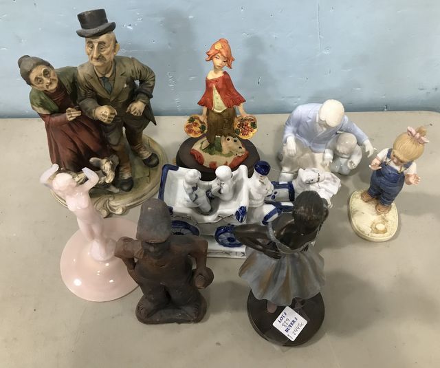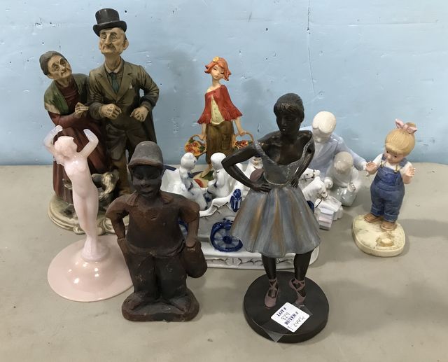8 collectible ceramic and resin figurines, one glass lady (damaged), 8 total. 8 collectible ceramic and resin figurines, one glass lady (damaged), 8 total.