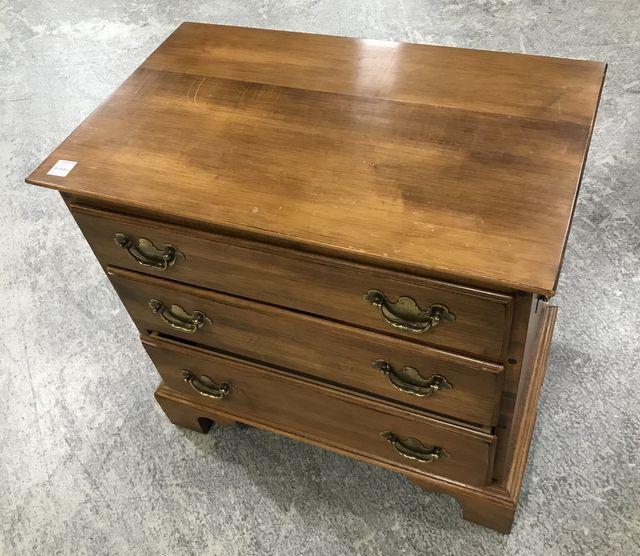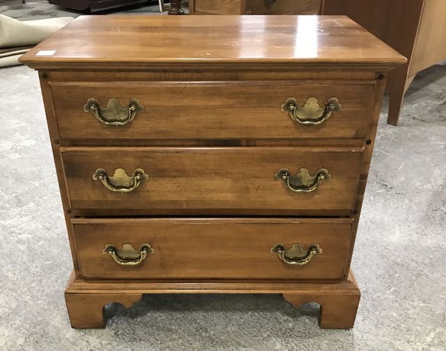 Ethan Allen Three Drawer Night Stand, Early American style, brass handles, 23"h., 23"w., 14"d. Ethan Allen Three Drawer Night Stand, Early American style, brass handles, 23"h., 23"w., 14"d.