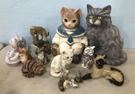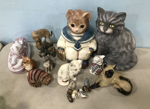 Group of Ceramic and Porcelain Cat Figurines, resin cougar, miniature cats, hand painted cat Cookie jar, and others, 15 total. Group of Ceramic and Porcelain Cat Figurines, resin cougar, miniature cats, hand painted cat Cookie jar, and others, 15 total.