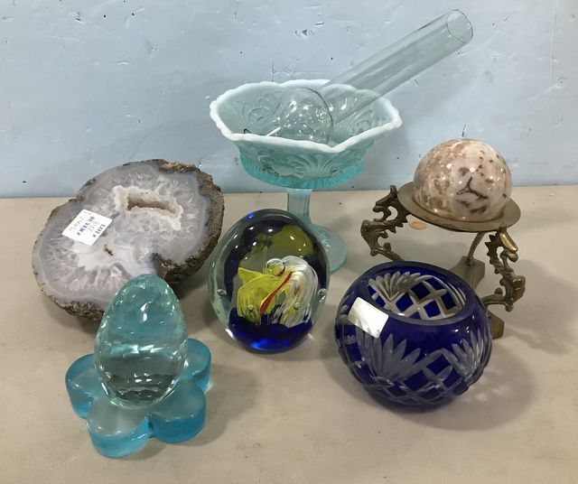 842 Polished Stone, Opalescent Glass Compote, Paperweight, and Cobalt Blue Vase