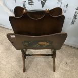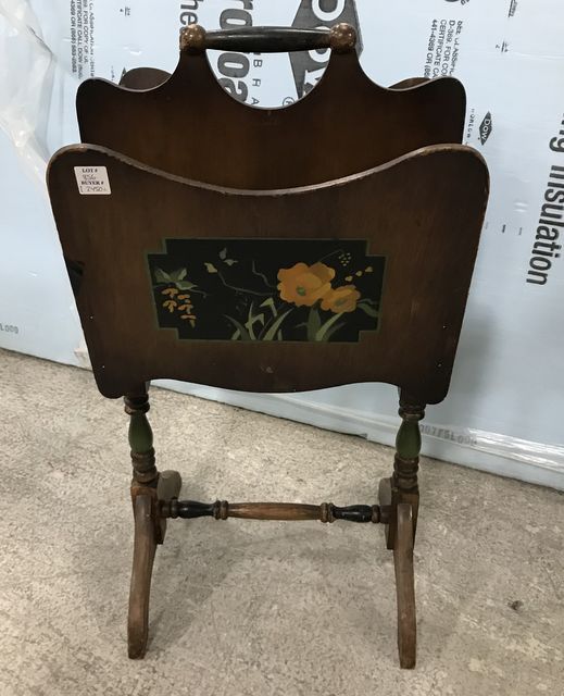 Vintage magazine rack stand, two section, handled, floral imagery, has finish wear, 27"h., 14"w. Vintage magazine rack stand, two section, handled, floral imagery, has finish wear, 27"h., 14"w.