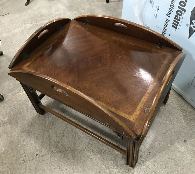Lane Butler's Tray Coffee Table, banded, cherry, four drop side panels, Chippendale style, has finish wear, 17"h., 31"w. Lane Butler's Tray Coffee Table, banded, cherry, four drop side panels, Chippendale style, has finish wear, 17"h., 31"w.