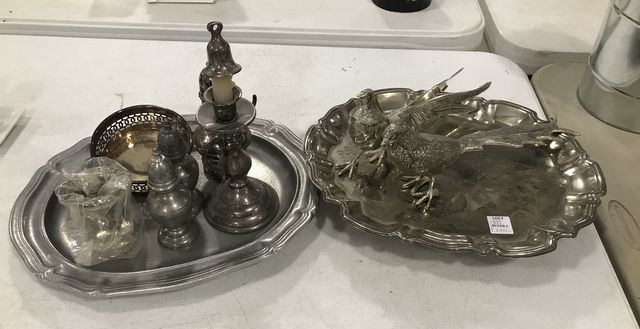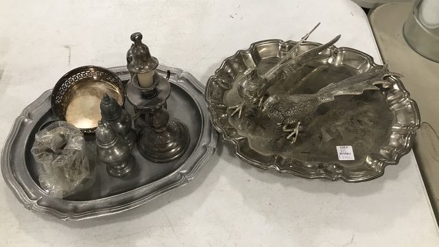Silver Plate footed tray, metal bird decor, pewter tray, salt and pepper shakers, dish, candle holders. Silver Plate footed tray, metal bird decor, pewter tray, salt and pepper shakers, dish, candle holders.