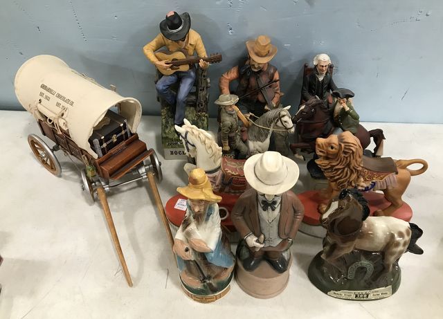 Group of Ceramic Whiskey Decanters, Hank Williams Jr, Wagon, cabin still, Kentucky straight, Robert E Lee, and others. Group of Ceramic Whiskey Decanters, Hank Williams Jr, Wagon, cabin still, Kentucky straight, Robert E Lee, and others.