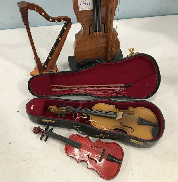 Miniature Collectible Instruments, Violins, harp, and battery operated Cello Miniature Collectible Instruments, Violins, harp, and battery operated Cello