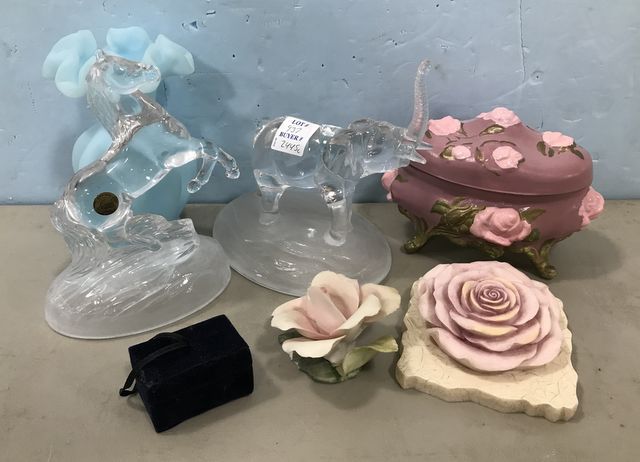 937 Glass Vase, Glass Horse and Elephant, Ceramic Trinket Box