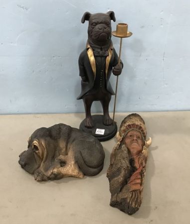 Bulldog candle stand, 15"h., Native American Chief wall plaque, resin hound dog. Bulldog candle stand, 15"h., Native American Chief wall plaque, resin hound dog.