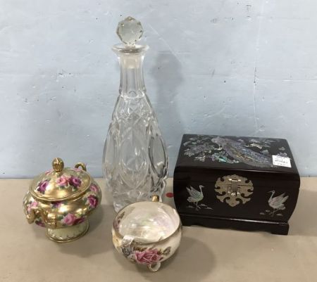 957 Inlaid Peacock Jewelry Box, Pressed Glass Decanter, Hand Painted Porcelain Sugar and Cup