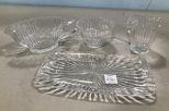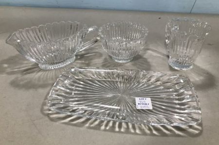 Pressed glass gravy, creamer, sugar, and tray. Pressed glass gravy, creamer, sugar, and tray.