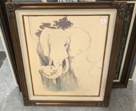 Elephants Drawing Print, framed, 30"h., 26"w. Elephants Drawing Print, framed, 30"h., 26"w.
