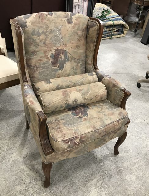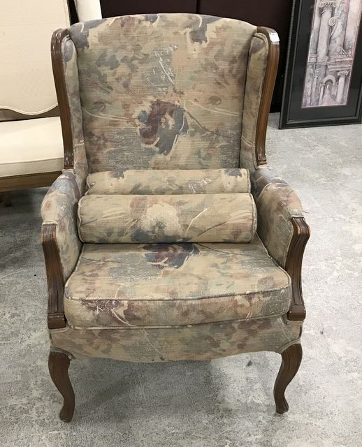 French Style Wing Back Arm Chair, two barrister pillows, cherry wood frame. French Style Wing Back Arm Chair, two barrister pillows, cherry wood frame.