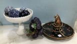Tiger Serving Dish, Glass Grape Decor, and Milk Glass Compote with Blue and White Balls Tiger Serving Dish, Glass Grape Decor, and Milk Glass Compote with Blue and White Balls