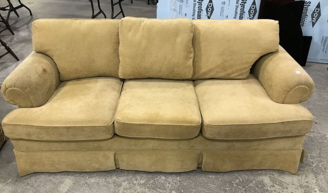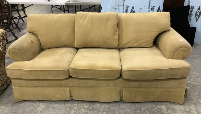 Tan Upholstered Three Cushion Sofa, one arm has stain, skirted, 7'. Tan Upholstered Three Cushion Sofa, one arm has stain, skirted, 7'.