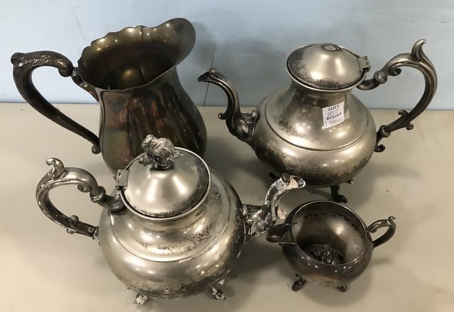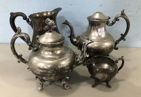 Two matching silver plated pitcher, one missing top finial is broke off, have the piece, silver plated water pitcher, creamer. Two matching silver plated pitcher, one missing top finial is broke off, have the piece, silver plated water pitcher, creamer.