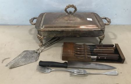 1045 Silver Plate Casserole Stand, Pie Knives, and Steak Knives