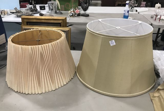 Lined silk drum shade (new) 21"base, 15"top, vintage pleated linen, good condition 18" base 13"top. Lined silk drum shade (new) 21"base, 15"top, vintage pleated linen, good condition 18" base 13"top.