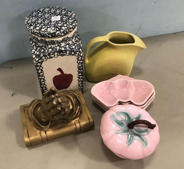 Ceramic Container, Pottery Pitcher, Dishes, Praying Hands. Ceramic Container, Pottery Pitcher, Dishes, Praying Hands.