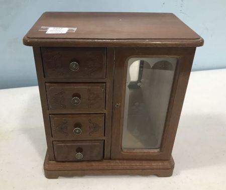 Wood small jewelry box, four drawers, door missing knob, 10"h., 9"w. Wood small jewelry box, four drawers, door missing knob, 10"h., 9"w.