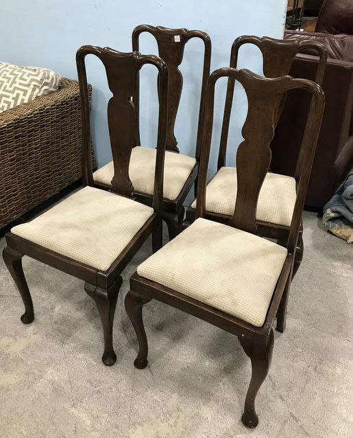 Modern Cherry Queen Anne Side Dining Chairs, dirty cushion, one chair missing front leg trim. Modern Cherry Queen Anne Side Dining Chairs, dirty cushion, one chair missing front leg trim.