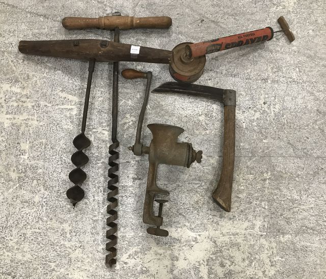 Primitive wood handle drills, antique grinder, handled blade, All Purpose sprayer. Primitive wood handle drills, antique grinder, handled blade, All Purpose sprayer.
