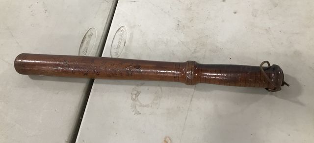 Wood Rug Beating Stick, hand crafted wood, with leather strap, 18"h. Wood Rug Beating Stick, hand crafted wood, with leather strap, 18"h.