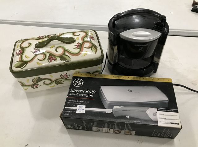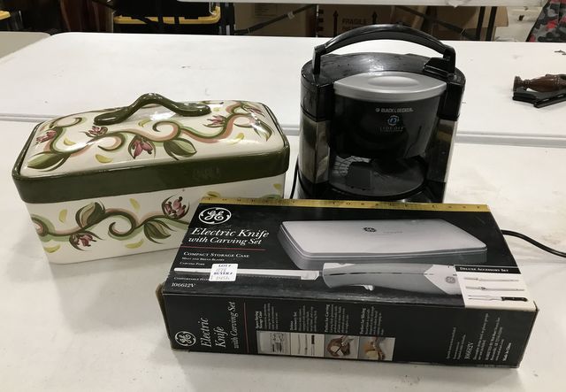 Black & Decker Jar Opener, Electric Knife, and Ceramic Container. Black & Decker Jar Opener, Electric Knife, and Ceramic Container.